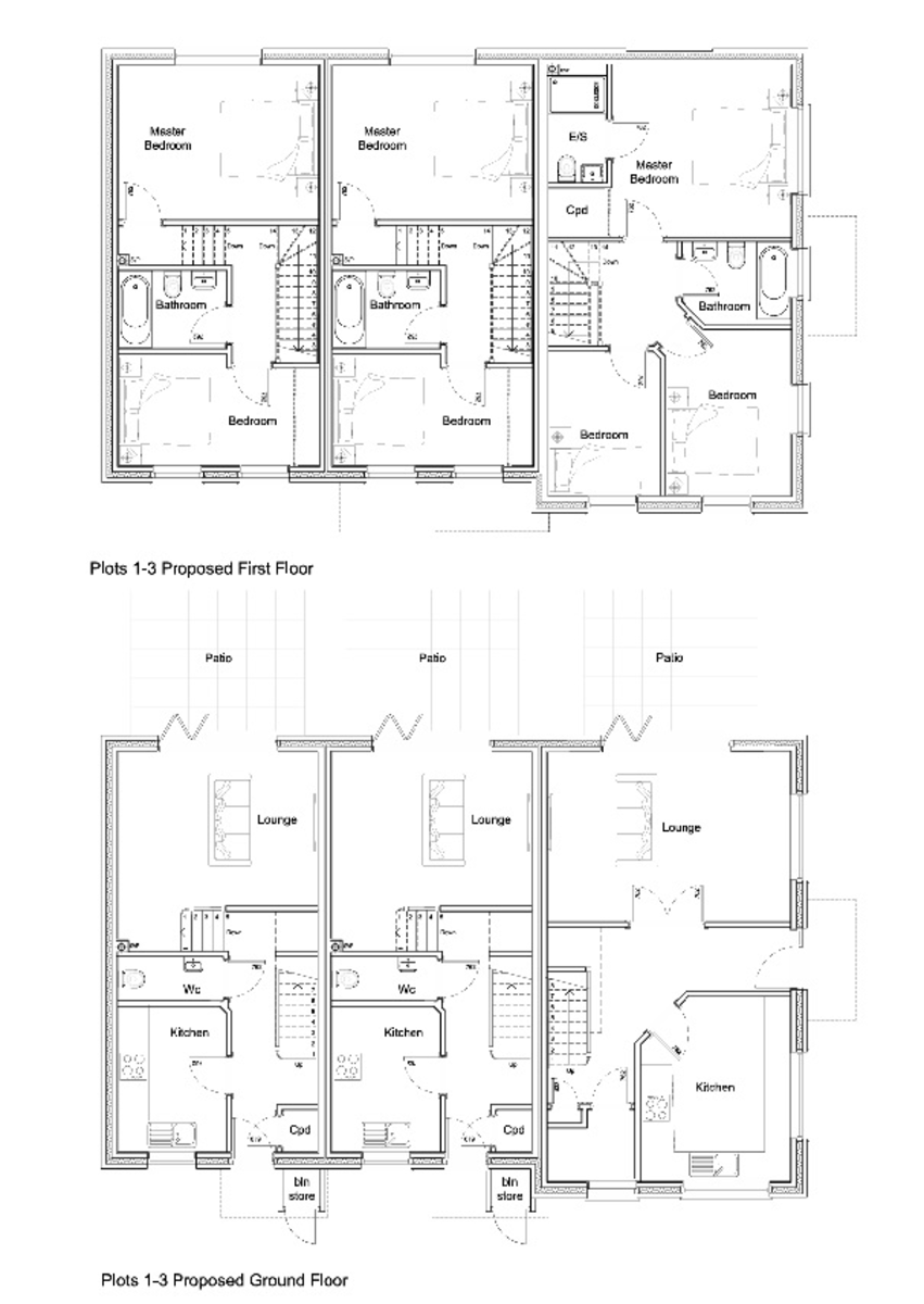 The terraced properties would be arranged over two storeys; two would be two-bedroom properties, and the largest end-terrace home would have three bedrooms. Of the two-bedroom houses, each would have a ground floor complete with a reception hall, a cloakroom, a kitchen and a sitting room. The top floor would include two double bedrooms plus a family bathroom. The three-bedroom property, meanwhile, would have a ground floor with a reception hall, a built-in cupboard, a kitchen and a sitting room. The top floor would feature a master bedroom with an en-suite shower room, two additional double bedrooms, and a family bathroom.