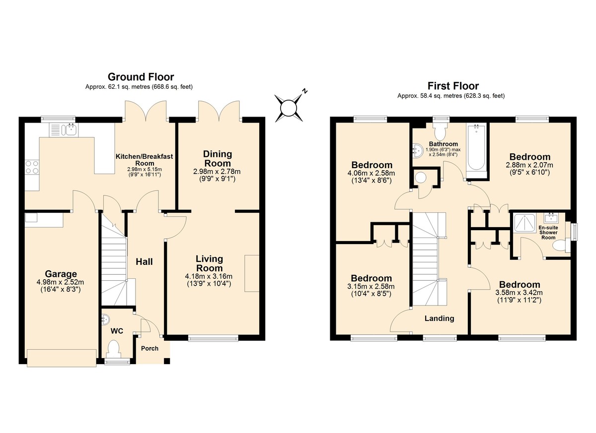 The first floor accommodates four generous double bedrooms. The principal bedroom enjoys a particularly pleasing outlook towards Chase Woods and benefits from fitted wardrobes, along with a well-appointed en-suite shower room featuring a walk-in shower, countertop vanity unit, and WC. The second bedroom shares a similarly appealing view and includes a built-in wardrobe. The remaining two bedrooms overlook the rear garden, one of which also has a built-in wardrobe.