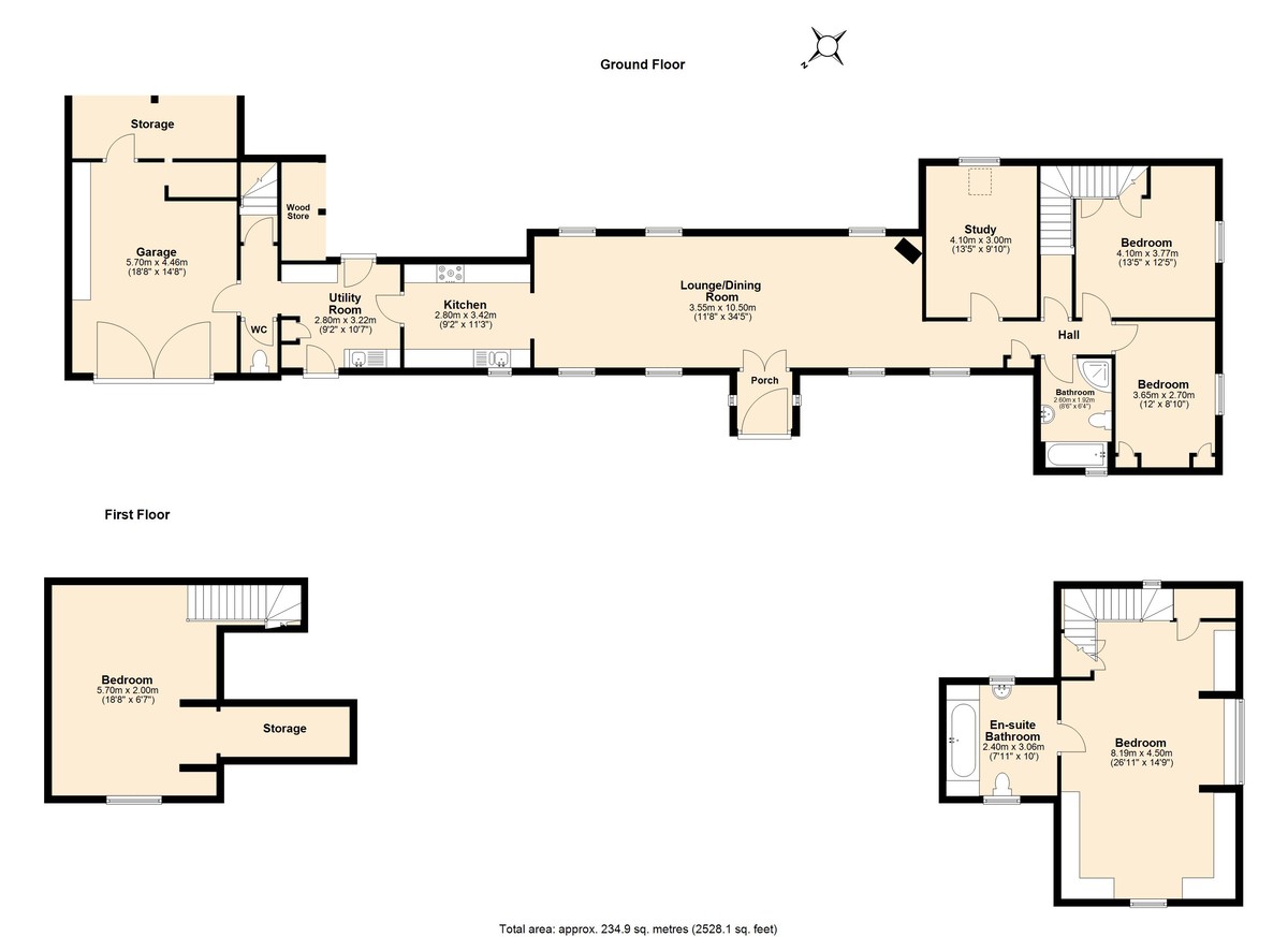 The two first-floor bedrooms are found on either end of the property, each having its own staircase linking it to the ground floor. The master suite is an elegant expanse with a vaulted, beamed ceiling - accentuating the zone's capacious size. There is low-level fitted storage, designed to wrap around a double bed. Plenty of light cascades into the dual aspect space through a picture window - exhibiting Goodrich Castle - and a triangular leaded window, which frames a view over Coppett Hill. The room also benefits from having a private en-suite bathroom, which has a three-piece suite.