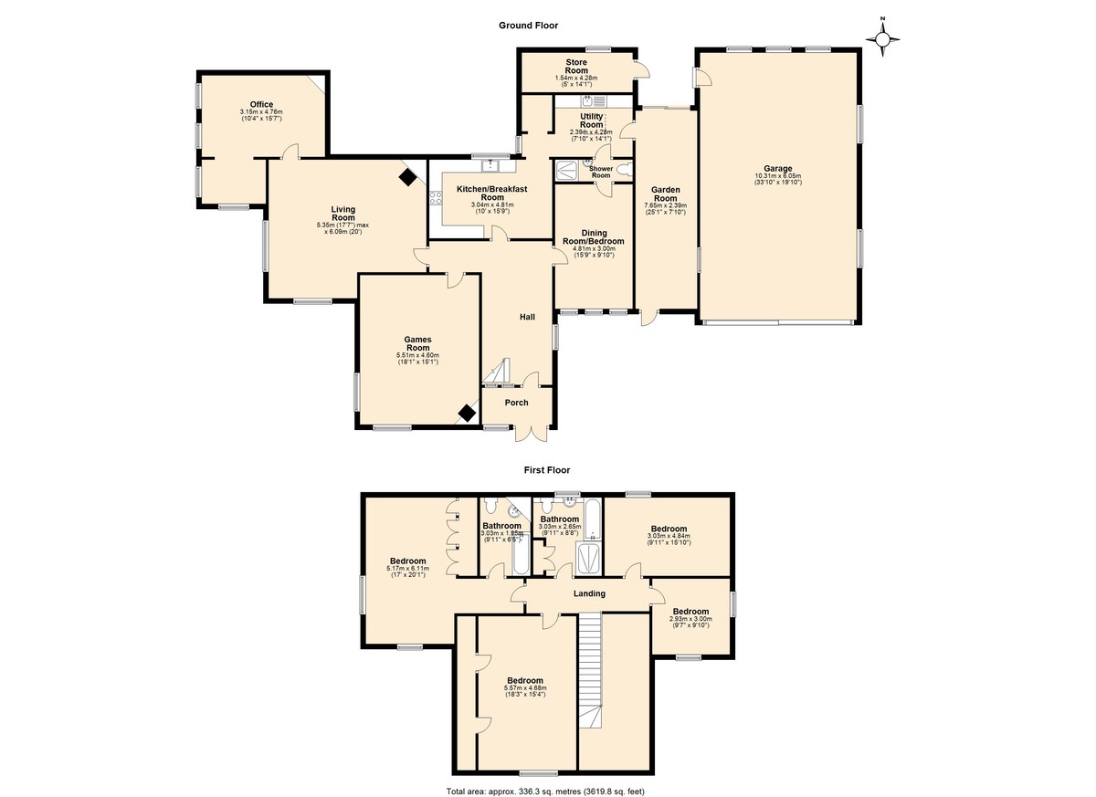 Four bedrooms, one with en-suite facilities • Sitting room • Games room • Dining room • Study • Garden room • Kitchen • Utility room • Family bathroom • Ground-floor shower room • Entrance Hall • Reception porch • Storeroom • Substantial integral garage • Gated driveway • Approximately half an acre