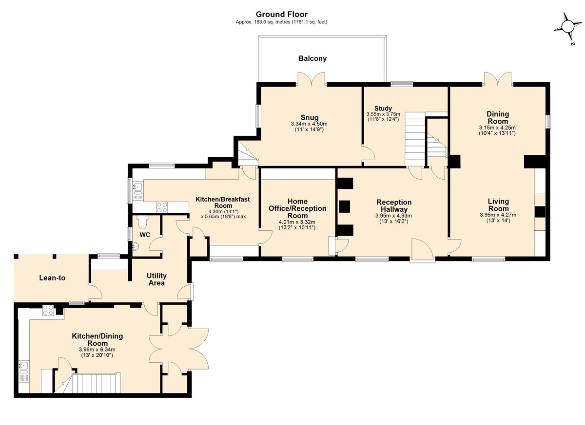 Beyond here, there is a triple-aspect dining kitchen with shaker style units and integrated appliances that include an AEG dishwasher and an under-counter fridge. There is also a 1 + 1/2 sink and a Zanussi double oven with a ceramic hob and an extractor fan. A recess - which would have once housed a range cooker now provides a nook suitable for a chest freezer. A door at the end of the kitchen leads through to a boot room-cum-utility which includes a cloakroom.