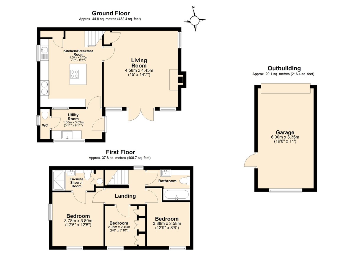 Upstairs, the property offers three well-proportioned bedrooms. The principal bedroom is especially impressive-an airy, light-filled retreat with dual-aspect windows framing far-reaching views across the surrounding countryside. The accompanying en-suite is stylishly appointed with a step-in, dual-headed shower, a countertop vanity unit, a Saniflo WC, a heated towel rail, and a marble-effect finish. There is also convenient access to an airing cupboard.