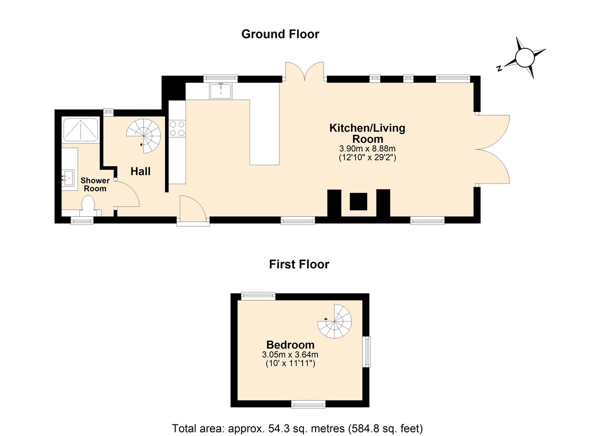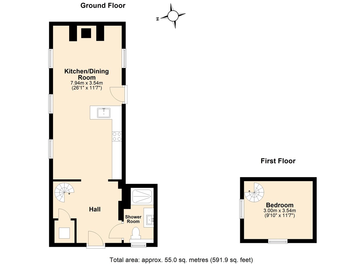 Each of the one-bedroom properties carries an open-plan living space with a fitted kitchen and lounge areas with feature fireplaces, which accommodate wood-burning stoves - a staple of country life. They also include ground-floor shower rooms and spiral staircases that lead to the double bedrooms.