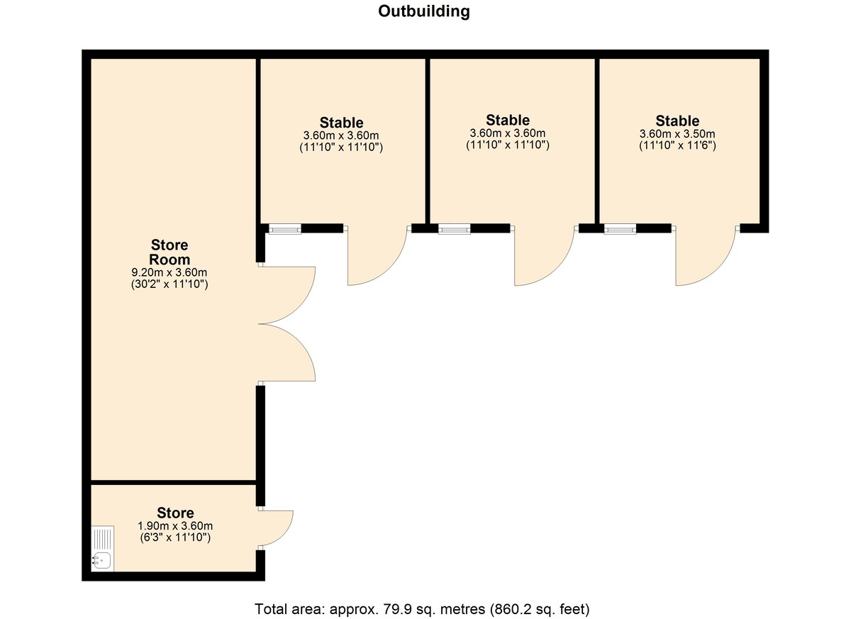 The two paddocks are positioned on either side of the L-shaped stable block, which includes the barn, tack room, and three stables.