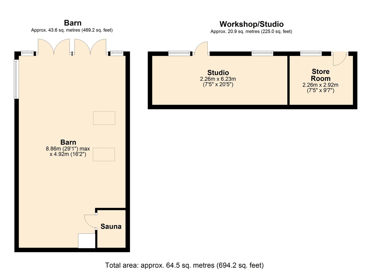 Steps lead down to the spacious, oak-framed garden building which contains a sauna, shower and kitchenette. On the other side of the house is another outbuilding with a workshop and a garden store.