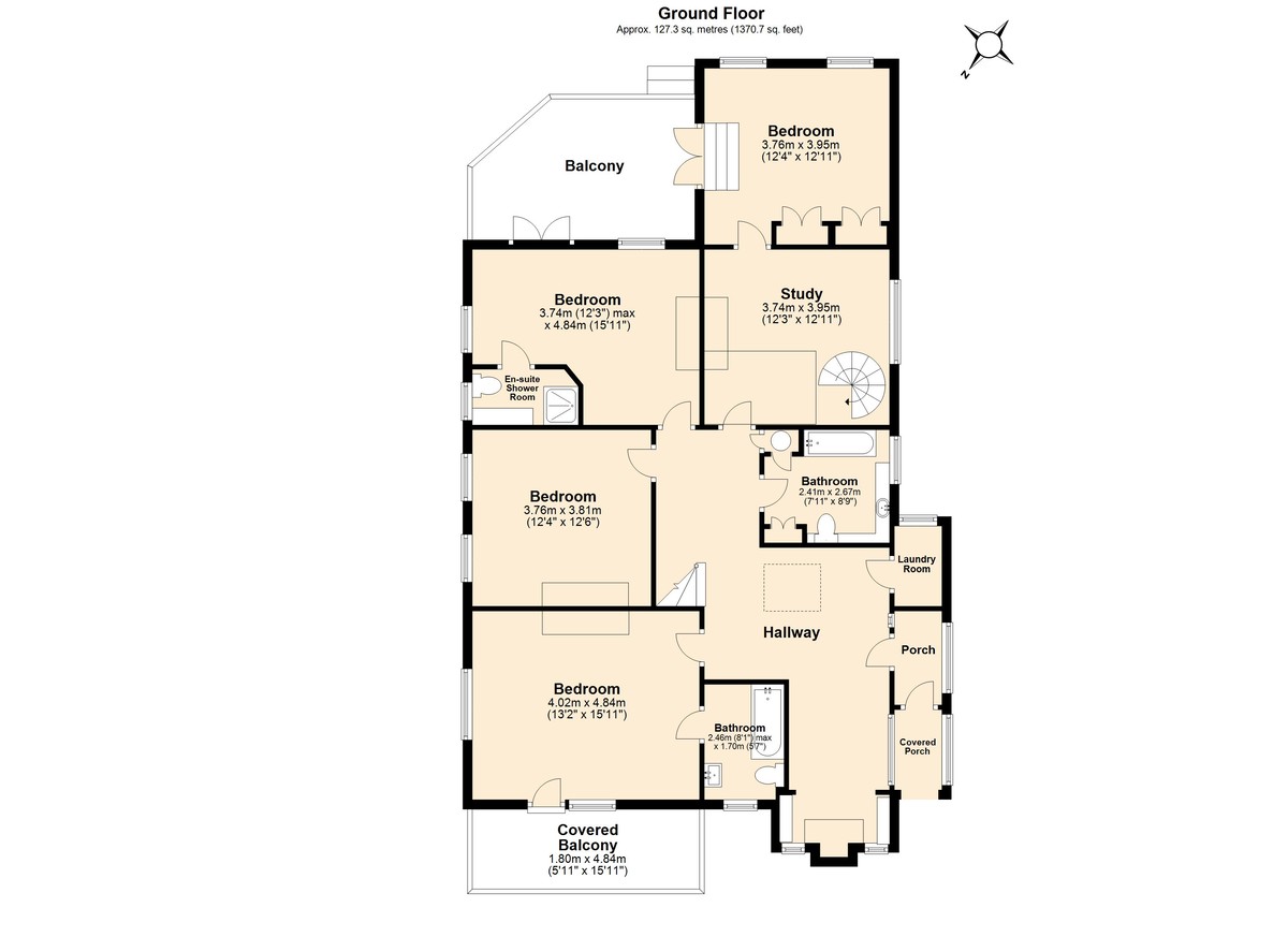 The entrance porch leads into a generous hallway with a vaulted ceiling, high built-in bookshelves and an original cast iron fireplace. On this floor are the four double bedrooms, family bathroom and library.
