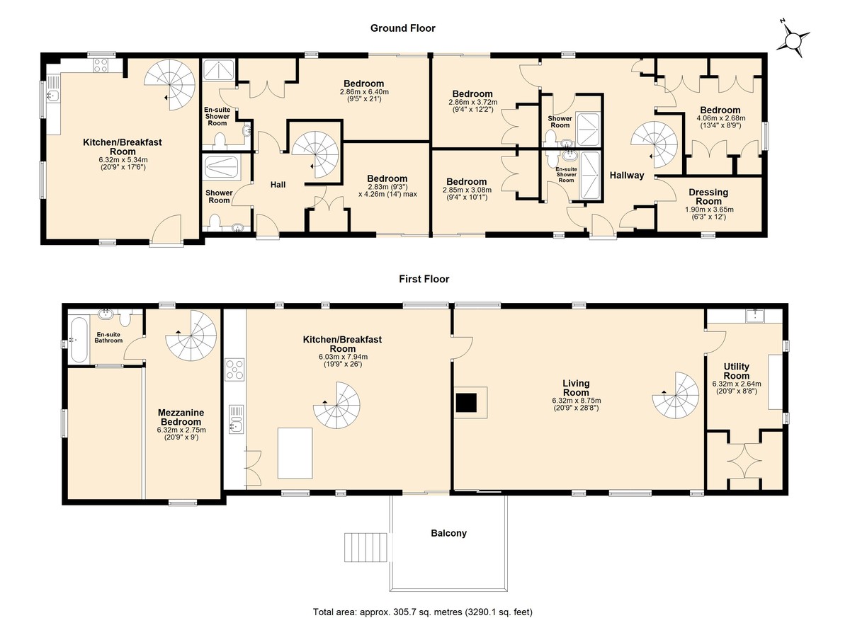 There are two spiral staircases which link the ground floor with the first floor, one leads into the open-plan dining kitchen, the other into a sitting room. Both spaces have vaulted ceilings with spectacular exposed trusses and timbers, timeless wooden floors and red sandstone walls - a richly coloured rock which is synonymous with the local area. Each also features a set of sliding glass doors which lead out to a balcony, presenting an impressive area to bask in the beauty of the natural landscape.